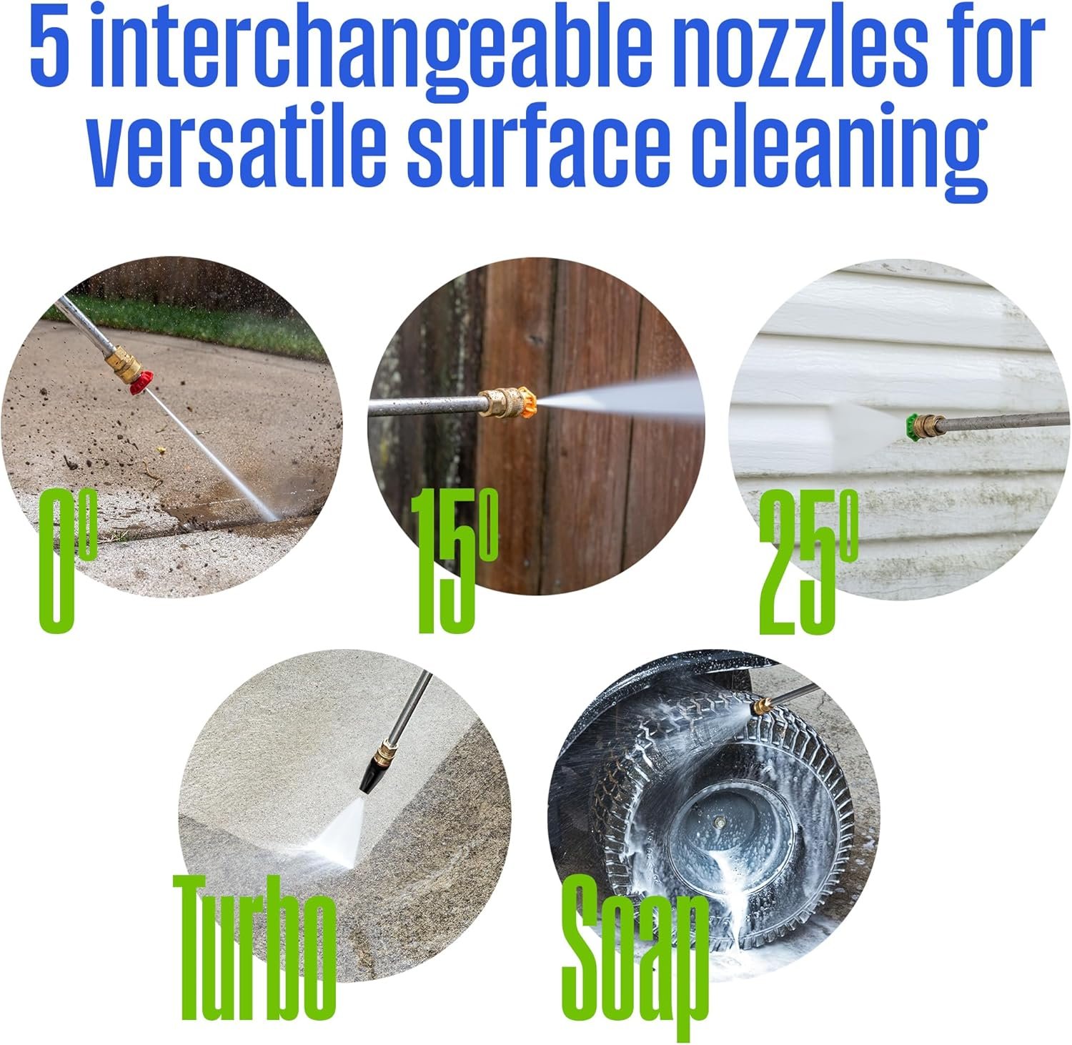 • Includes multiple nozzles plus soap tank — versatile for different surfaces and cleaning jobs.