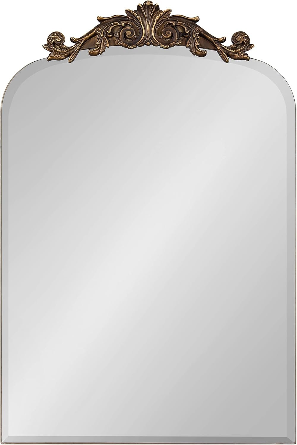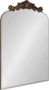 Kate and Laurel’s Arendahl Beveled Frameless Arch Mirror is a decorative wall mirror designed mainly for use above a bathroom vanity, in a bedroom, or in an entryway. It combines a simple frameless arched glass panel with an ornate antique-gold crown detail, giving you a baroque look without a heavy full frame. At 20 x 30 inches, it’s sized to serve as a functional mirror for daily use while also acting as a focal point on the wall.