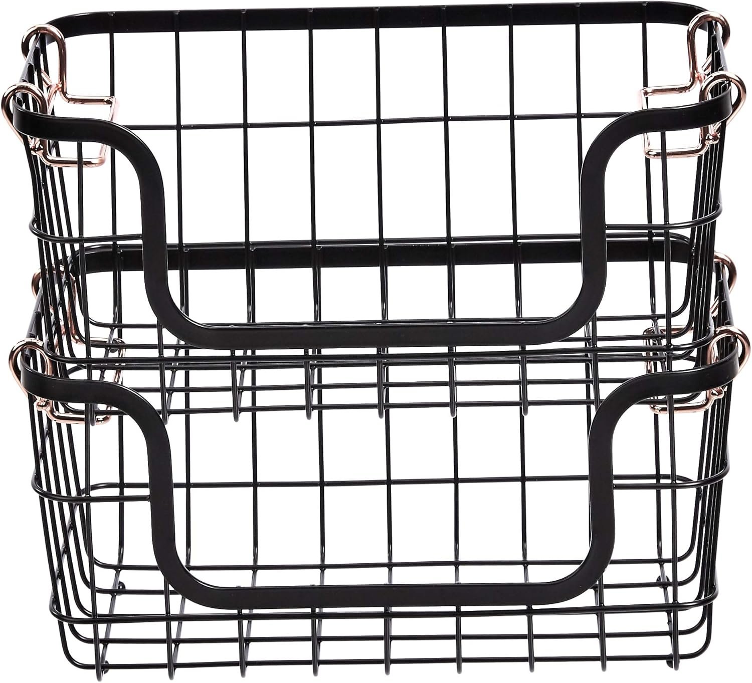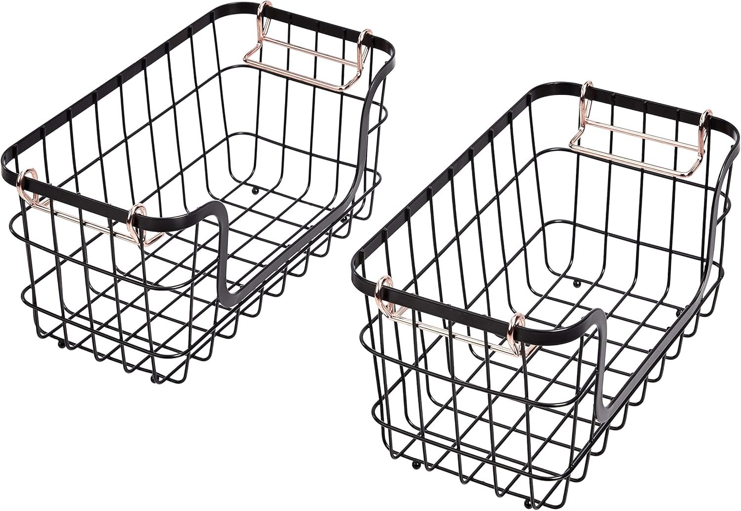 The Amazon Basics Stackable Metal Wire Rectangular Storage Basket Set is a versatile and stylish organization solution for your kitchen or bathroom. Featuring durable steel wire construction and elegant rose gold handles, these baskets offer portable and stackable storage for produce, bath essentials, or office supplies. With no assembly required and a space-saving design, this set of two baskets makes decluttering effortless and chic, perfect for any modern home.